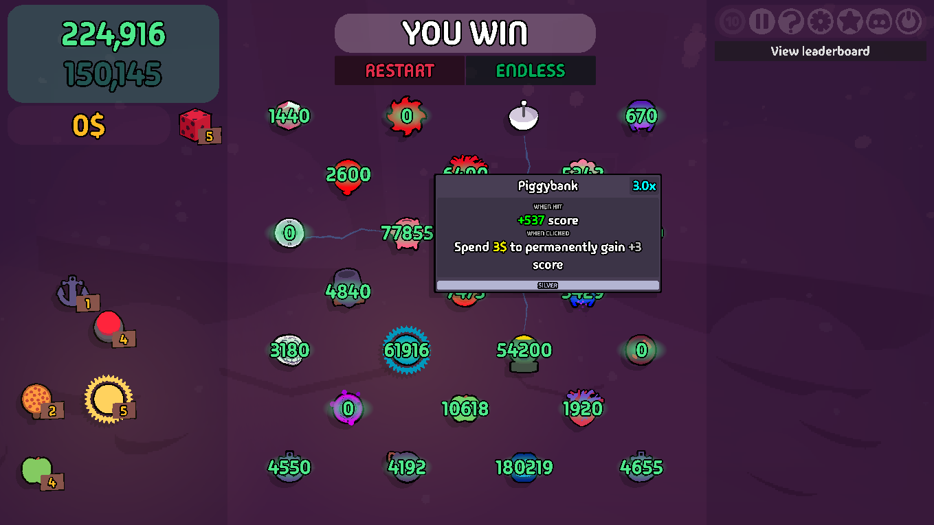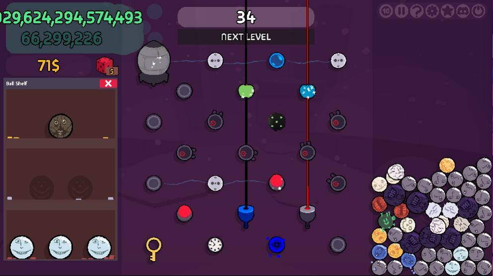 Place down pegs then drop a ball to start the Rube Goldberg machine of chaos. Pegs have unique functions and can be used in various creative ways, such as creating a pocket dimension filled with bombs or using umbrellas to shoot balls with mortars and turrets or just create an alternate universe that generates you infinite money to supply your main universe.